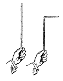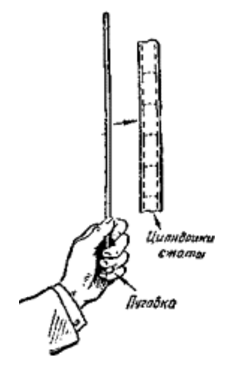 После того как зрители убедятся, что в руках исполнителя обычная веревка, можно переходить к показу номера. Артист берет в руку тот конец веревки, к которому прикреплена пуговица. Зажав пуговицу между мизинцем и безымянным (или средним) пальцами, исполнитель натягивает леску, скользнув большим и указательным пальцами вдоль нее. Такое движение пальцев прижмет плотно друг к другу цилиндрики, и веревка замрет в вертикальном положении (рис. 4).