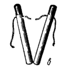 Палочки с трех сторон должны быть закругленными, а с четвертой гранеными. Внутреннее отверстие выводится на закругленную часть палочки. Когда отверстия в палочках будут готовы, в них надо продернуть веревочку длиной 60-65 см, которая соединит обе палочки в нижних концах (рис. 2).