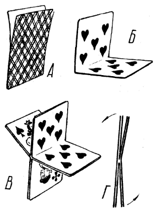 Он заключен в особом устройстве нашей карты. Для ее изготовления нам потребуются целых четыре карты: в нашем случае это дама виней, червонная десятка, король треф и бубновый валет. Карты должны быть атласными, другие для наших целей не годятся. Прежде всего каждую карту придется с помощью ножа расслоить, отделив ее от сорочки (спинки), - рис. 35, А. Затем, точно по середине, карты сгибаются под прямым углом (рис. 35, Б). Далее согнутые карты склеиваются между собой в виде своеобразной вертушки-книжки, изображенной на рисунке 35, В.