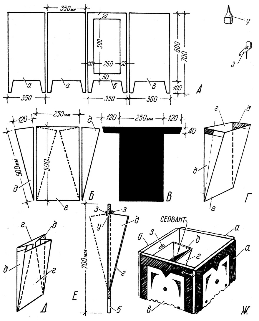 Взяв один прямоугольник г и приложив е обеих его длинных сторон, вплотную к ним, треугольные куски д, наклеим все три детали на черный материал и, хорошо просушив под прессом, обрежем острым ножом лишний материал, выходящий за пределы склеенных деталей. Теперь треугольники д, скрепленные материалом с прямоугольником г, могут складываться поверх прямоугольника, как это показано на рис. 39, Б пунктиром с двумя точками. Второй прямоугольник г тоже наклеим на черный материал, но так, чтобы после обрезки у верхней его кромки остались отходящие в стороны полоски материи длиной по 120 мм (рис. 39, В). С помощью этих полосок второй прямоугольник прикрепляется к треугольникам д, которые соединены с первым прямоугольником г следующим образом: верхние кромки треугольников от линии их прикрепления к первому прямоугольнику и до средней линии намазываются клеем (на рис. 39, Г это место зачерчено), и к ним приклеиваются полоски второго прямоугольника г. У нас получился своеобразный, черный внутри, карман-сервант (рис. 39, Г), который может складываться, становясь совершенно плоским, как изображено на рис. 39, Д. Отложим на некоторое время наш сервант в сторону и перейдем к наружной отделке створок ширмы. Каждая створка в отдельности по наружной стороне сплошь оклеивается материей, лучше новой, имеющей рисунок, но можно и старой, окрашенной в яркий цвет. После просушки под прессом излишки материи обрезаются острым ножом или бритвой. Некоторую сложность представляет отделка створки б, в которую вделан качающийся сервант, поэтому о ней мы расскажем несколько подробнее. Постелив на пол газету, на нее кладут створку б, а в имеющееся в середине ее окно вкладывают изготовленный нами вант в сложенном (плоском) виде. Сервант кладется наружу той сторонкой, к которой приклеены треугольники д. Выровняв поверхности створки и серванта в одну плоскость, их обклеивают материалом. Просушив под прессом, лезвием безопасной бритвы прорезают материал сквозь щель между створкой и сервантом, но только с трех сторон, по верхней и боковым сторонам серванта. Материал, соединяющий нижнюю кромку серванта со створкой б, будет служить своеобразной петлей, на которой сервант откидывается наружу.