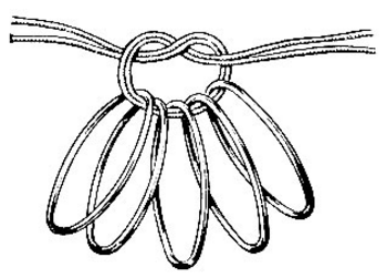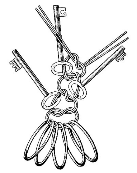 Исполнитель показывает двоим вызванным из публики помощникам кольца и ключи и просит тщательно осмотреть их. Потом показывает два шнурка и берет у помощника кольца; продевает через них шнурки и завязывает узлом (рис. 4). Дает одному из помощников держать два конца от шнурков - по одному шнурку в каждой руке. Взяв ключи, продевает шнурки в один из них и опять завязывает узлом вместе с кольцами, а два остальных конца дает держать второму помощнику. Берет следующий ключ, продевает в него шнурки, взятые у первого помощника, завязывает концы узлом и отдает их держать тому же помощнику. Взяв два конца у второго помощника, продевает их в третий ключ, снова завязывает узлом и отдает концы второму помощнику. (Для ясности на рис. 4 и 5 все узлы показаны не совсем затянутыми.)