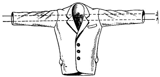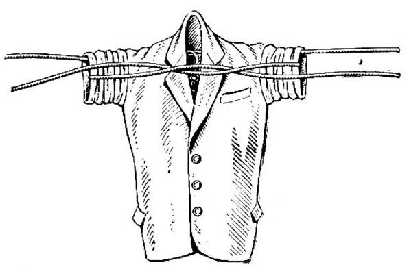 Помощник держит концы шнурков, а исполнитель, зайдя за пиджак, просит у каждого из них дать ему по одному шнурку. Ассистенты поддерживают пиджак, каждый на одном шнурке, а фокусник стягивает шнурки узлом, тем самым связывая рукава пиджака (см. рис. 6) и отдает по одному шнурку помощникам. Нужно следить, чтобы они держали в каждой руке по шнурку и не сильно их натягивали, иначе будет труд но развязывать узлы.