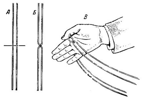 Разложив шнурки рядом, перевязывают их ровно по середине белой ниткой (рис. 21, А). Затем их сгибают в месте их связки (рис. 21, Б) таким образом, что если закрыть нитку, то будет казаться, что шнурки свободно лежат на руке (рис. 21, Б). Ладонь должна быть не видна зрителям. Можно место связки зажать между указательным и большим пальцами левой руки и этим скрыть связку.