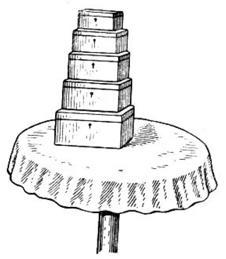 ЭФФЕКТНЫЕ ФОКУСЫ И ИХ РАЗГАДКИ Загадочная посылка. Секрет фокуса Справочник / Эффектные фокусы и их разгадки Описание фокуса: Фокусник просит у зрителей одолжить на время несколько ценных вещей: кольца, сережки, браслеты, часы. Собрав их на тарелочку, возвращается к столу и вызывает одного из зрителей к себе на сцену. Дает ему держать шелковый платочек. Показывает вещи по одной и спрашивает, чьи они. Затем кладет их также по одной в платочек, который держит зритель. Показав таким образом все вещи и положив их в платок, берет его и завязывает узлом. Потом дает "помощнику" в руки деревянную коробку и, выдвинув из нее ящичек, просит положить туда узелок с вещами, что тот и делает. Коробку закрывают. - Подержите, пожалуйста, эту коробку с ценностями, - говорит иллюзионист. - Хорошо ли вы держите? Вы уверяете, что хорошо? Разрешите проверить. Исполнитель берет коробку, выдвигает ящичек, но вещей там нет. Идет с ней к столу и, взяв палочку, стучит внутри ящика ко робки, доказывая, что вещей там нет. В это время в конце зала раз дается голос: "Товарищ, вам срочная посылка". Фокусник кладет коробку на стол и разговаривает с человеком, который несет обвязанный бечевкой ящичек. Получив в руки "посылку", кладет ее на стол, раскрывает и вынимает красиво разрисованную шкатулку. Ассистент приносит столик, на который ставит шкатулку. Исполнитель отпирает ее, достает вторую шкатулку и ставит рядом с первой. Иллюзионист отпирает вторую шкатулку и вынимает из нее третью, которую ставит на стол, а вторую - поверх первой. Отпирает третью шкатулку, достает из нее четвертую и опускает ее на стол, а третью шкатулку ставит поверх второй. Отпирает четвертую шкатулку, вынимает пятую, а четвертую ставит на третью. Отперев пятую (рис. 68), вынимает из нее шестую, в которой что-то стучит при встряхивании.