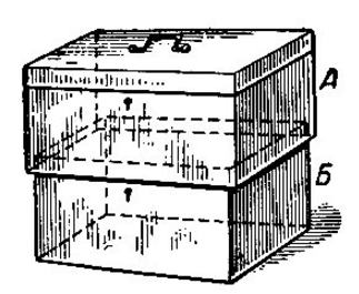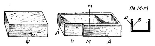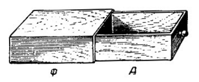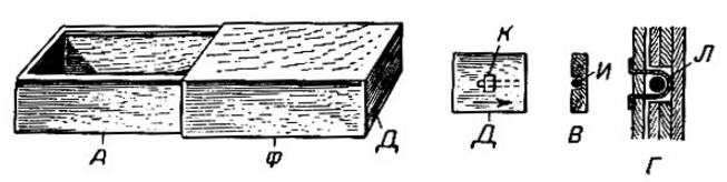 Теперь приступим к изготовлению ящика. Он состоит из двух частей: четырехстенного ящика А и пятистенного ящика Б, который легко двигается в ящике А (рис. 82). На ящике Б видна вертикальная скобка Л, которая входит в отверстие К (оно изображено на рис. 80). Ящик со скобкой должен свободно ходить в ящике А. Чтобы он не выпал, сделаны предохранители. Ящик Б нужно незаметно скрыть в ящике А. С этой целью делают закрайки, маскирующие ящик Б, когда он вдвинут в А. Если смотреть на ящик А с вдвинутым в него ящиком Б, то будет казаться, что у вас всего один ящик.
