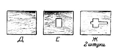 Штифт И при таком повороте стенки, когда левый угол будет вверху, должен совсем уйти из отверстия К и перейти по ходу в направлении, указанном стрелкой на рис. 80, Д, освободив скобку Л. При наклоне стенки в противоположную сторону штифт войдет в другой конец своего хода и запрет скобку Л. Вырежьте из трехмиллиметровой фанеры четыре дощечки- стенки (рис. 81). В одной из них проделайте посередине отверстие размером 8х15 мм и на двух дощечках Ж, кроме таких же отверстий, прорежьте еще ход для штифта длиной 45 мм вправо и 10 мм влево. Теперь обмажьте клеем дощечку Д и положите на нее дощечки Ж. В узкое продольное отверстие вложите штифт, ход для которого тщательно зачистите. Ширина хода такова, что штифт должен свободно двигаться и легко входить в отверстие. Вложите штифт, осторожно обмажьте дощечку клеем и сверху положите четвертую дощечку Е. Затем все склеенные дощечки положите под пресс. После того как высохнет клей, за чистите эти дощечки для дна футляра.