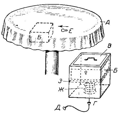 Когда все это будет выполнено, приделайте к ящику А ручку (см. рис. 79). Теперь приступайте к изготовлению футляра Ф, который дол жен быть сделан так, чтобы в него свободно и без лишнего трения входили оба ящика. Повернув футляр правым боком немного вниз, вы заставите штифт перейти в правую сторону хода. Вставьте в футляр ящики, когда они войдут в него полностью, поверните футляр в противоположную сторону - штифт перейдет влево. Поставив футляр прямо, попробуйте выдвинуть за ручку ящик А. При этом ящик Б останется внутри футляра и будет скрыт от зрителей, а вещи, положенные в коробку, "исчезнут". Следует хорошо потренироваться в применении ящика. Нужно добиться непринужденности движений: наклоны коробки, не обходимые для передвижения штифта, должны казаться естественными. Чтобы вещи в ящике не стучали, завяжите их в мягкий платок, перед тем как положить в коробку. Зная принцип действия коробки, можно на его основе самому придумать какой-либо иллюзионный аппарат. Если показывать коробку достаточно четко и быстро, она про изводит большой эффект на зрителей. Секрет фокуса: Один из секретов ясен из описания коробки-воровки. Второй секрет заключается в столике, который выносит помощник, после того как исполнитель вынет из "посылки" первую, самую большую шкатулку. Схема этого столика изображена на рис. 83, где А - верхняя доска стола; Б - трап, в котором спрятана самая последняя, шестая шкатулка с вещами. Схема трапа показана отдельно. Это небольшой ящик без крышки, с гладкими внутренними стенками. Размеры ящика - его длина и ширина - точно такие же, как длина и ширина шестой шкатулки, которая должна свободно в нем двигаться вверх и вниз. Буквой В обозначена шестая шкатулка; 3 - это стенка-дно, которое легко перемещается внутри ящика Б. Пружина Ж прикреплена одним концом внутри ящика к дну, а вторым концом упирается в подвижную стенку-дно 3 и двигает его вверх до уровня стола. Чтобы пружина не подняла стенку-дно выше стола, к ней прикреплен шнурок, пропущенный посередине пружины от верха через дно ящика. Шнурок имеет ограничитель Г; если его подтянуть пружиной к дну, то он остановит ее подъем. На конце шнурка прикреплена заклепка Д, которая служит для того, чтобы задержать подъем пружины, когда шкатулка опущена в ящик. Верх подвижной стенки дна оклеивается такой же материей, как и скатерть на столике.