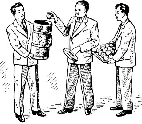 Простые мячи внешне такие же, как и складные, могут быть набиты любым материалом: они размещаются в конусе цилиндра. Размер подноса нужно рассчитать так, чтобы на нем уложились все 36 мячей. Секрет фокуса: Секрет заключается в конструкции цилиндра, клеток, шкатулки и складных мячей. Перед сеансом обе клетки надевают одна на другую, помещают в цилиндр и закрывают крышкой. Другой его конец открыт (помощник выносит его в таком виде); на сцене исполнитель кладет туда все мячи, беря их с подноса. Затем заряжают шкатулку. Выпадающее дно кладут на закраины и, слегка задвинув крышку, начинают укладывать складывающиеся мячи, как об этом говорилось выше. Расположив последний ряд мячей, крышку задвигают совсем. Простые мячи кладут на поднос. На этом вся подготовка к выступлению заканчивается. Помощник выносит цилиндр в вертикальном положении: вверху должно находиться отверстие конуса, а внизу - клетки. Ассистент при этом незаметно придерживает нижнюю крышку, предохраняя ее от открывания. Когда мячи будут положены и цилиндр закрыт крышкой, помощник держит цилиндр горизонтально, левой рукой прижимая крышку, где лежат мячи, а правой- крышку, где находятся клетки. При таком положении лег ко обмануть внимание зрителей. Когда нужно будет вынуть клетки, помощник просто и непринужденно поднимет цилиндр вверх правой рукой, откроет крышку и достанет из цилиндра одну за другой обе клетки. Вынося шкатулку, ассистент должен очень крепко держать ее в руках, чтобы не выронить. Указательный палец лежит на ручке двигающейся закраины. Во время мнимого падения нужно успеть незаметно отвести ручку в сторону, чтобы выпадающее дно упало вниз, а мячи, расправившись, заполнили всю шкатулку. Есть и другие способы держать цилиндр и освобождать па дающее дно, но мы считаем описанные нами самыми удобными. Любителю, конечно, предоставляется полная возможность самому изменить и придумать другую конструкцию выпадающего дна, это не так трудно осуществить. Автор: Вадимов А.А.