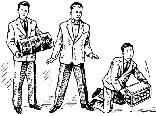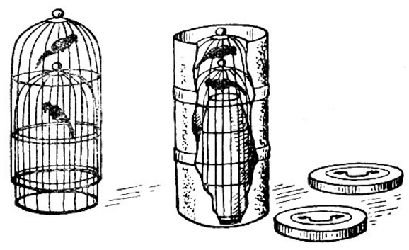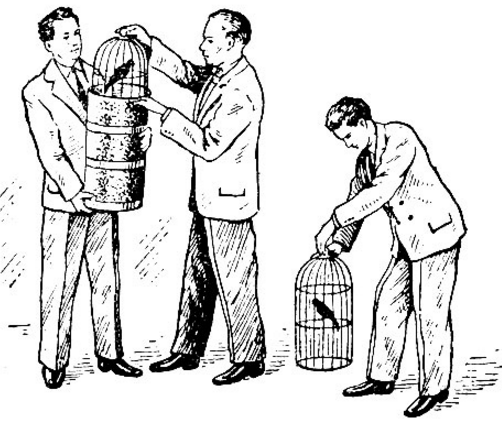 Исполнитель берет шкатулку с мячами показывает ее зрителям, а помощник в это время выносит из- за кулис поднос, на который исполнитель и высыпает из шкатулки все мячи; затем, подойдя к другому помощнику, открывает крышку цилиндра и вынимает из него одну за другой две большие круглые клетки с живыми птицами (рис. 141).