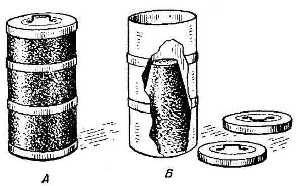 Реквизит: Цилиндр с секретным приспособлением, оклеенный бархатом. Стеклянная шкатулка с секретным приспособлением. Две большие круглые клетки, вкладывающиеся одна в другую. 36 складывающихся мячей. 36 простых мячей. Обыкновенный простой поднос. Цилиндр (рис. 179, А) может быть изготовлен из жести, прочного картона или двухмиллиметровой фанеры. Длина его около 50 см, диаметр около 25 см.