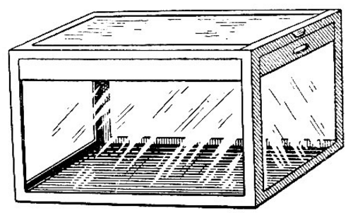 Ассистент, унеся пустой поднос за кулисы, возвращается и подходит к иллюзионисту, передавая ему вынесенную им небольшую прозрачную стеклянную шкатулку. Эта шкатулка по виду напоминает аквариум. Бока ее скреплены никелированными углами, а дно и крышка сделаны из никелированных металлических листов. Шкатулка прозрачна, и поэтому всем видно, что она абсолютно пуста. Исполнитель показывает ее зрителям и отдает помощнику; тот, идя на место, спотыкается, и зрители замечают, что закрытая сверху и снизу шкатулка вся заполнилась мячами (рис. 140).