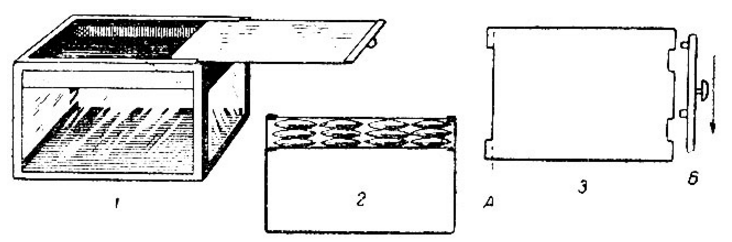 Выдвижная крышка и дно медные, никелированные, а стенки из толстого стекла; хорош для этой цели трехмиллиметровый плексиглас (рис. 181, 1). Верхний борт шкатулки шириной около 25 мм маскирует секретное выпадающее дно из никелированной меди толщиной 2 мм (рис. 181,5). Одним своим краем это дно внутри шкатулки кладут на небольшую закраину А (ее положение показано слева пунктиром), правым же краем - на подвижную закраину Б, которая вделана в правую сторону широкого борта.