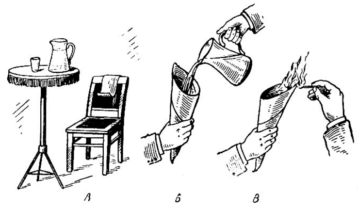 Íà ñöåíå ñòîèò ñòîëèê ñ êóâøèíîì, íàïîëíåííûì âîäîé, è ñòóë, íà ñïèíêå êîòîðîãî âèñèò ëèñò áóìàãè (ðèñ. 211, À). Ôîêóñíèê íàëèâàåò èç êóâøèíà â ñòàêàí âîäó è âûïèðàåò åå. Ïîñòàâèâ ñòàêàí íà ñòîëèê, áåðåò ñî ñòóëà ëèñò áóìàãè è ñâåðòûâàåò èç íåãî ôóíòèê (ïàêåòèê); áåðåò êóâøèí è ëüåò èç íåãî âîäó â ôóíòèê (ðèñ. 211, Á). ×òîáû äîêàçàòü, ÷òî âîäà íàõîäèòñÿ â ïàêåòèêå, îí âûëèâàåò ÷àñòü âîäû îáðàòíî â êóâøèí. Çàòåì ñíîâà ëüåò âîäó â ôóíòèê. Ïîñòàâèâ ñîñóä íà ñòî ëèê, èñïîëíèòåëü ïðîñèò ïîìîùíèêà çàæå÷ü ñïè÷êó. Âçÿâ åå, ïîä íîñèò ê êðàþ ôóíòèêà è çàæèãàåò áóìàãó. Ôóíòèê ñãîðàåò äî êîíöà â ðóêàõ èëëþçèîíèñòà.