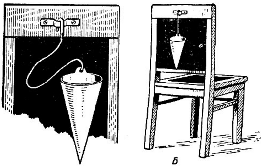 Ñåêðåò ôîêóñà çàêëþ÷àåòñÿ â ïðèñïîñîáëåíèè, êîòîðîå èçîáðàæåíî íà ðèñ. 212, À. Ýòî íåáîëüøîé ôóíòèê, âìåùàþùèé 200-300 ã âîäû è ñêëååííûé èç öåëëóëîèäà. Îí èìååò óøêî, ê êîòîðîìó ïðèâÿçûâàþò òîíêóþ ïðî÷íóþ ðûáîëîâíóþ ëåñêó äëè íîþ 25 èëè 30 ñì, â çàâèñèìîñòè îò äëèíû öåëëóëîèäíîãî ôóíòèêà è äëèíû íåïðîçðà÷íîé ñïèíêè ñòóëà. Äðóãèì êîíöîì ëåñêó ïðèâÿçûâàþò ê íåáîëüøîìó ìåòàëëè÷åñêîìó êðþ÷êó, êîòîðûé ëåã êî ìîæåò âõîäèòü â æåëåçíóþ ñêîáêó, óñòðîåííóþ òàêèì îáðàçîì, ÷òî åå ìîæíî äâóìÿ øóðóïàìè ïðèâåðíóòü ñçàäè ñïèíêè ñòóëà (ðèñ. 212, À).
