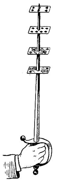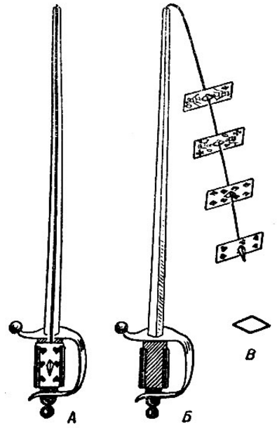 Рапира сделана из меди или латуни толщиной 5 или 10 мм, внутри она полая. Длина ее около 70 см, а ширина внизу около 2 см. Рапира четырехгранная, в разрезе имеет вид ромба (рис. 214, В), к концу суживается (верхние ее края равны 4 мм). К рапире приделывается верхний острый конец. Нижний же должен быть точно равен верхнему и иметь стороны по 4 мм каждая (см. рис. 214, А и Б). Эфес делают из дерева и меди. В дереве просверливают сквозное отверстие, в нижний конец рукоятки ввертывают металлический полушарик, который виден на рисунках. К этому кружочку привязывают эластичную, очень упругую резину (можно использовать велосипедную ниппельную трубку). Для нее в середине полушария имеется при паянный крепкий крючок. Второй конец резины при вяжите к низу острого верх него кончика рапиры - для этого там делается крепление. Сбоку деревянной рукоятки припаяйте медную пластинку с отогнутыми краями, куда, как в футляр, вставляют четыре карты, надетые на резину (см. рис. 214,А). Чтобы карты не выскочили раньше времени, на эфесе устроено небольшое стопорное приспособление, удерживающее их. Беря в руки рапиру, фокусник освобождает из-под стопора карты и придерживает их до нужного момента ладонью правой руки, прижимая к пластинке с загнутыми бор тиками. Как только зритель бросит колоду вверх, иллюзионист, сделав выпад и изображая, что он ловит карты в воздухе, на самом деле отпускает карты в рапире. Резина тотчас же подтянет их к верхнему ее краю. Верхний конец станет на свое место- и зрители увидят, что рапира проткнула четыре нужные вам карты. Карты, в которых сделаны необходимые вырезы, расположатся по всей длине клинка. Для этого в шестерке черв делают только прокол, в который должна пройти резина. В следующей карте - ромбовидный вырез такого размера, чтобы она остановилась сантиметрах в пятнадцати от первой. В следующих картах вырезы должны быть один больше другого, чтобы они рас положились на рапире, как показано на рис. 214. Длина резины должна быть такой, чтобы она притягивала наконечник вплотную к концу рапиры. Рапира должна быть хорошо отникелирована. Понятно, что, беря рапиру со стола, фокусник должен тщательно закрыть ладонью от зрителей четыре карты с кончиком рапиры. Натяжение резины можно регулировать, вынимая нижнее полушарие рукоятки. Внутренние края верха рапиры должны быть тщательно закруглены и зачищены, чтобы избежать пореза резинки. Автор: Вадимов А.А.