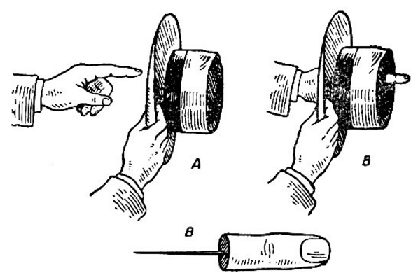 Ñåêðåò çàêëþ÷àåòñÿ â èñêóññòâåííîì ïàëüöå, ñäåëàííîì èç äåðåâà èëè ïàïüå-ìàøå è îêðàøåííîì ïîä öâåò ðóêè è íîãòÿ  ïàëåö âäåëàíà äëèííàÿ ñòàëüíàÿ èãëà (ðèñ. 219, Â). Íàäåâ øëÿïó íà ðóêó, ôîêóñíèê äåðæèò âíóòðè âûòÿíóòûé óêàçàòåëüíûé ïàëåö. Çàòåì, íåçàìåòíî âçÿâ â ïðàâóþ ðóêó èñêóññòâåííûé ïàëåö è äåëàÿ âèä, ÷òî ãëàäèò ïî âåðõó øëÿïû, ïîä ïðèêðûòèåì ëàäîíè âòûêàåò èãëó ñâåðõó.  ýòî âðåìÿ ïàëåö â øëÿïå ñãèáàåòñÿ, è ðóêà åùå äàëüøå âõîäèò âíóòðü, ñîçäàâàÿ âïå÷àòëåíèå, ÷òî ïàëåö ïðîòêíóë âåðõ øëÿïû. Âçÿâ âíóòðè çà èãîëêó, èñïîëíèòåëü âðàùàåò ïàëåö, ïîêàçûâàÿ, ÷òî âðàùàåò ðóêó.