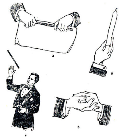 Фокусник показывает "волшебную палочку зрителям и рассказывает "правдивую" историю о том, как палочка от индийского факира попала к нему. Зрители, осматривающие палочку, не видят в ней ничего необыкновенного. Исполнитель "обижается": он положил было палочку во внутренний карман костюма, но, раздумав, тотчас же вынимает ее обратно. В доказательство ее необыкновенных свойств иллюзионист проделывает следующее. Завертывает палочку в лист бумаги (рис. 27, А) и держит ее на вытянутой правой руке (рис. 27, Б). Затем он соединяет обе руки вместе (рис. 27, В). Сверток смят. Палочка исчезла.