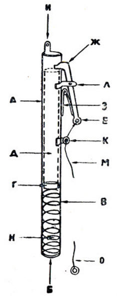 Палочка должна свободно войти в эту трубку. Палочка показана пунктиром Д, сама трубка обозначена буквой А. Длина трубки зависит от силы и длины пружины В, которую прочно приделывают ко дну Б. В свободном состоянии пружина должна немного выходить за верхний край трубки. На верхнем конце приспособления припаян кружочек Г для упора палочки. К кружочку в центре привязана прочная капроновая нитка, она ограничивает движение пружины и не позволяет кружку выйти за пределы трубки. Нитка Н другим концом прикреплена ко дну трубки Б. К трубке припаяна еще пластинка И с отверстием, нужным для того, чтобы приспособление можно было пришить внутри кармана в определенном положении.