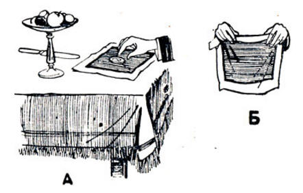 Èñïîëíèòåëü ïðîñèò ó êîãî-ëèáî èç çðèòåëåé îäîëæèòü íà âðåìÿ ïÿòíàäöàòèêîïåå÷íóþ ìîíåòó è çàìåòèòü åå: ñäåëàòü â ëþáîì ìåñòå ÷åðòó. Ìîíåòó îí êëàäåò íà ðàçîñòëàííûé íà ñòîëå ïëàòîê (ðèñ. 47, À). Çàòåì ïðèïîäíèìàåò óãëû ïëàòêà è íàêëàäûâàåò èõ ïî îäíîìó íà ìîíåòó, çàêðûâàÿ åå. Ïðîñèò îäíîãî èç çðèòåëåé ïîäîéòè è ïîòðîãàòü ñåðåäèíó ïëàòêà, ÷òîáû óáåäèòüñÿ, ÷òî ìîíåòà íàõîäèòñÿ íà ìåñòå. Ïîñëå ýòîãî ôîêóñíèê ïåðåäàåò çðèòåëÿì äëÿ îñìîòðà ïðîñòîé íîæ, ïðåäëàãàåò îäíîìó èç íèõ âûáðàòü ëþáîå èç ëåæàùèõ íà âàçå ÿáëîê è äåðæàòü åãî â ðóêàõ. Áåðåòñÿ îáåèìè ðóêàìè çà ñåðåäèíó ïëàòêà (ðèñ. 47, Á) è áûñòðî åãî ðàçâåðòûâàåò. Ìîíåòà èñ÷åçëà.