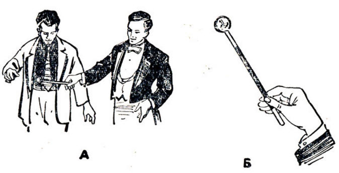 Фокусник, говоря о свойствах "волшебной" палочки, идет в публику и заявляет, что в трудную минуту палочка может выручить его - дать денег столько, сколько потребуется. Подойдя к одному из зрителей, исполнитель опускает палочку во внутренний карман пиджака и тотчас же вынимает ее (рис. 50, А). Зрители видят, что на конце палочки появился "серебряный" рубль (рис. 50, Б). Иллюзионист берет рубль в левую руку и кладет монету в стакан. Затем он точно таким же способом "достает у зрителей" еще несколько "серебряных" рублей, наполняет ими стакан; затем, высыпав монеты на поднос, показывает зрителям.
