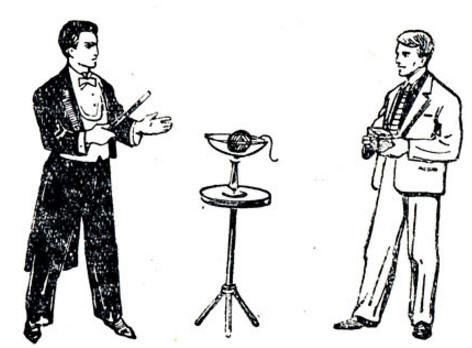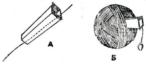 öèëèíäð À ïðîäåâàþò ñ óçêîé ñòîðîíû êîíåö òîëñòîé øåðñòÿíîé èëè ãàðóñíîé íèòêè (ðèñ. 69, À). Çàòåì íà ýòîò æå êîíåö öèëèíäðà íàìàòûâàþò øåðñòü, äåëàÿ êëóáîê íóæíîãî ðàçìåðà. Êëóáîê ñ âñòàâëåííûì â íåãî öèëèíäðîì è òîð÷àùåé îòòóäà íèòêîé êëàäóò çà êóëèñàìè. Êîãäà ôîêóñíèê ñòàâèò êîðîáêó íà ñòîë, îí íåçàìåòíî ìàñêèðóåò êîëüöî, íàõîäÿùååñÿ ó íåãî â ðóêå, çà êàêèì-íèáóäü ïðåäìåòîì, íàïðèìåð çà "âîëøåáíîé" ïàëî÷êîé.