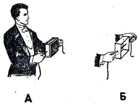 Показав ящичек, исполнитель надевает его на кубик, который входит в него совершенно свободно. Затем показывает зрителям, что отверстия ящичка и кубика совпадают. Взяв в руки небольшой кусок шторного шнурка длиной сантиметров 80, фокусник продергивает его сквозь ящичек и кубик (рис. 70, А). Исполнитель продергивает шнурок взад и вперед несколько раз, затем передает концы шнурка кому-либо из зрителей, а сам быстро берется за кубик и легко вынимает его из ящичка, который остается прошитым насквозь шнурком (рис. 70, Б).