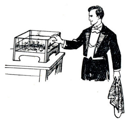 Справочник / Эффектные фокусы и их разгадки Описание фокуса: Иллюзионист ставит на стол пустой аквариум - для доказательства проводит внутри рукой. Помощник подает исполнителю прозрачный кувшин с водой. Фокусник выливает воду в аквариум и просит принести ему еще воды. Подается второй, третий, четвертый кувшин... Зрители видят, что аквариум доверху наполнен чистой водой. Взяв со стола платок, исполнитель покрывает им аквариум так, чтобы все отчетливо видели ножки, на которых он стоит, а также просвет между столом и дном сосуда. Публике ясно: дно аквариума никак не сообщается со столом. Но тут фокусник сдергивает покрывало - и зрители видят, что в аквариуме среди водяных растений плавают рыбки (рис. 91).