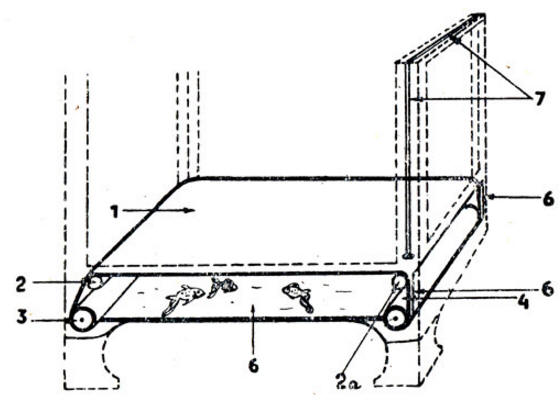 Под прикрытием боковых бортов вделана вращающаяся на осях шторка 1, которая изготовлена из непромокаемого материала. Чтобы шторка могла легко скользить, в боковых длинных стенках вделаны роликовые катки 2, легко вращающиеся в осях и при этом изгибающие шторку; шторка свободно наматывается на валик 3 с валика 4. Валик 3 имеет внутри спиральную пружину, которая все время стремится тянуть его влево. Таким образом, валик на осях вращается против часовой стрелки. Правый валик 4 сделан из дерева. Он может свободно вращаться на осях. На валик намотана по краям узкая стальная полоска от маленькой рулетки, которая проходит внутри вдоль краев аквариума и незаметна зрителям. Одним концом она приделана к валику 4 вблизи стенок аквариума, а вторым - к боковым краям шторки 1. Сама шторка на правой стороне имеет прочную планку, к которой она приклепана наглухо в нескольких местах. Планка стальная толщиной в 2 мм и шириной в 5 мм. Шторку делают длиннее аквариума сантиметров на 16, ее левый конец прикрепляют наглухо к валику 3 и наматывают на него. На валик также наматывают и остальные полоски от рулетки. Затем валик прочно вставляют в гнезда, в которых его ось держится неподвижно. Внутри правой боковой стойки проходит гибкая стальная проволока, к нижнему концу которой приделан штифик (рис. 92). При помощи пружины она опускается вниз в отверстие, сделанное в правом валике 2 а. Таким образом, тормозится обратное сматывание шторки на валик 3. Чтобы это произошло, нужно слегка потянуть за проволочку 7 в середине правого верхнего борта аквариума; стерженек выйдет из валика 2 а, а также из отверстия, сделанного для него в шторке 1; шторка тотчас же начнет перематываться на левый валик 3. сдерживаемая стальными полосками 6. Перемотавшись на левый валик, шторка открывает дно аквариума, где в воде заранее сидят посаженные рыбки и растения. Как только шторка откроет дно аквариума, рыбки тотчас же поднимутся вверх и будут плавать в аквариуме, а растения всплывая расправятся. Для зарядки шторки в середине ее правого конца сделан язычок 6, за который можно смотать шторку с валика 3 на 4. При этом правой рукой необходимо наматывать остальные ленты на правый валик 4. Когда шторка полностью закроет дню аквариума, нужно вставить пружинный штифт в отверстие шторки и ролика 2 а. Теперь вся механика аквариума готова к показу. Если слегка оттянуть проволочку штифта 7, то пружина левого валика молниеносно сработает, намотает на себя шторку, и низ аквариума будет открыт; рыбки выплывут наверх, а зрителям покажется, что аквариум каким-то необъяснимым способом наполнился. Они не заметят момента открытия шторки, так как все происходит под прикрытием платка-покрывала. Воду для рыбок наливают на дно аквариума вплоть до шторки. Механика действует надежно, но необходимо тщательно протирать трущиеся части для предохранения от ржавчины. После выступления вынимают рыбок, сливают воду, хорошо протирают и просушивают аквариум. Автор: Вадимов А.А.
