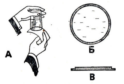На рис. 108, Б показан кружок сверху, а на рис. 108, В - сбоку. Теперь, если мы приложим кружочек к стакану, наполненному до краев водой, и выдавим излишки воды, то кружок настолько прочно войдет в сосуд, что не сможет отпасть, а получившийся у нас бортик не даст кружку скользить. Нечего опасаться, что при перевертывании стакана вода из него выльется.