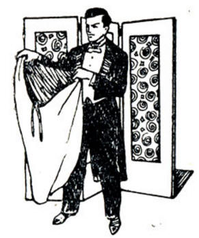 Затем, раскрыв мешок, сажает в него ассистента и предлагает желающим из публики "запечатать" помощника. Шнуры мешка стягивают и завязывают узлом. Приносят зажженную свечку, палочку сургуча и небольшую фанерную дощечку Концы шнуров припечатывают сургучом к фанерной дощечке и ставят печать монетой или каким-либо кольцом. Зрители отходят в сторону, а мешок закрывают трехстворчатой ширмой. Фокусник встает рядом и считает: "Раз! Два!". Из-за ширмы доносится "Три!" - и мешок чьей-то рукой перекидывается через ширму. Исполнитель поднимает его (рис. 165, А). Мешок пустой. Помощник выходит из-за ширмы, берет мешок у фокусника и несет его в публику показать, что он по-прежнему завязан и опечатан.