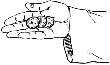 Любителям, начинающим осваивать искусство манипуляции, хотелось бы дать три совета: 1. Не показывайте ни одной манипуляции в кругу товарищей или знакомых, не выучив ее "назубок". Первая же неудача или случайный срыв могут вас обескуражить, и вам покажется, что вы не сможете овладеть этой техникой. 2. Возьмите себе за правило никогда не делать дважды одной и той же манипуляции перед одними и теми же людьми. 3. Никогда не показывайте, даже ради шутки, механизма манипуляции, иначе все ваши будущие фокусы не будут иметь у зрителей никакого успеха. Запомните раз и навсегда: Манипуляционные приемы сами по себе не являются фокусом, это лишь одно из средств, применяемых для достижения эффекта. При неудачах не теряйтесь, тотчас же их исправляйте. Совершенствуйте свое мастерство, оттачивайте артистизм, овладевайте новыми знаниями, умело используйте то, что знаете, смелее и больше экспериментируйте и на основе старых, известных номеров создавайте свое, новое, придумывайте оригинальные трюки и смелее используйте их в своей работе. Советы к пассировкам с монетами. Здесь описано несколько различных пассировок, однако исполнитель может использовать только те, которые больше ему понравятся и легче будут усвоены. Достаточно хорошо владеть двумя-тремя различными пассировками. Выбор их зависит от индивидуальности исполнителя, от величины ладони, строения кистей рук. Всякий способ, при помощи которого можно держать монету скрытой от глаз зрителя, может быть применен для пассировки. Например, некоторые манипуляторы держат монету, зажимая ее между пальцами или между большим пальцем и углублением в ладони. Каждая пассировка должна быть тщательно отработана и выполняется как бы механически, причем обе руки должны быть совершенно одинаково развиты. Если вы исполняете пассировку, повернувшись к зрителям левым плечом, выполняйте вариант, при котором монета передается из правой руки в левую. Если же стоите, повернувшись правым плечом, то здесь примените пассировку, при которой монета якобы передается из левой в правую. Это даст вам возможность легче пальмировать монету во время пассировки, а также позволит незаметно опустить пальмированную монету в потайной карманчик - пошет, как его называют манипуляторы. Пошет либо пришивается, либо для этой же цели используются карманы обычного пиджака. Тренироваться в манипуляциях следует стоя перед зеркалом. Внимательно, не торопясь, ознакомившись с описанием манипуляции, обдумайте все детали ее технического выполнения, мысленно представьте себе каждое движение. Взяв в руки монету, шарик или карты, повторите все движения перед зеркалом - сначала каждое в отдельности, а затем все вместе. Заметив ошибку, тотчас же исправьте ее. Движение, которое трудно дается, нужно хорошо выверить в соответствии с текстом и рисунком, доработать и тренироваться до тех пор, пока оно не будет исполнено легко и чисто. Сначала разучивайте номер, держа предмет в руках, а затем, хорошо запомнив, последовательно повторите фокус перед зеркалом, не глядя себе на руки, уже без предмета. Внимательно следите за тщательностью отработки каждого движения рук и пальцев, за точностью, чистотой и изяществом исполнения. Артистизм подачи номера начинайте вырабатывать с малого. Зрители всегда внимательно следят за руками исполнителя. Поэтому илл