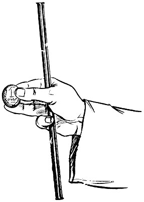 После этого она займет положение, как на рис. 14, то есть продвинется к середине пальцев. Зрителям монета не будет видна, так как ее прикрывают три средних пальца. Быстро согните пальцы правой руки, обхватывая ими монету. Прямые пальцы могут вызвать подозрение у зрителей. Нужно остерегаться того, чтобы, передвигаясь в руке, монета не ударилась о палочку: это может вызвать звук.