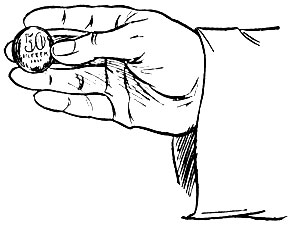 Затем, как будто бы беря монету, сделайте движение, причем правая рука, направляясь снизу вверх, как бы сметает монету из левой руки. На самом же деле в тот момент, когда монета загораживается от зрителей, пальцами правой руки ее заставляют соскользнуть с кончиков пальцев в ладонь левой руки, а правая рука тотчас же поднимется вверх, как будто бы держа монету. Пассировка с несколькими монетами позволяет пассировать с тремя, четырьмя или более монетами, причем позвякивание их в руке еще более усиливает эффект. Монеты берут в правую руку, как на рис. 10, держа на ладони как можно ближе к кисти.