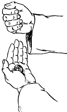 Немедленно пальмируйте монету, напрягая мускулы ладони, и снова выпрямите пальцы, как показано на рис. 1. Тренируясь, сначала сохраняйте руку неподвижной; лишь усвоив движение, выполняйте его, поднеся правую руку к открытой ладони левой руки (рис. 4).