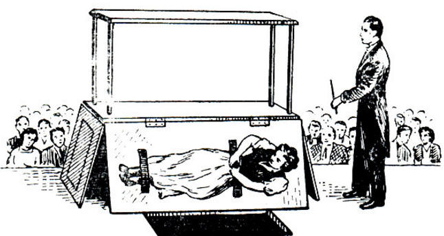 Реквизит: Два деревянных "козла", на которые ставится дно ящика. Ящик длиной 180 см, шириной 80 см и высотой 70 см. Этот ящик разбирается на части, то есть каждая его стенка должна быть сделана так, чтобы ее можно было независимо от других стенок снимать с петель. Высота "козел" должна быть равной высоте ящика, то есть 70 см. Это необходимое условие успешной работы аппарата. Чтобы усилить эффект фокуса, можно на ассистентку направить луч прожектора, меняя цвета стекол. Для этого ассистентка должна быть в белом платье. Секрет фокуса: Высота "козел", как мы уже говорили, одинакова с высотой стенок ящика. В полу как раз позади "козел" устроен трап. В тот момент, когда иллюзионист доказывает последний раз, что ящик пуст, и опускает стенки ящика, которые касаются пола, ассистентка выходит из трапа и прицепляется к задней стенке ящика с помощью ручных и ножных петель, специально сделанных для этой цели. Необходимо помнить, что сначала поднимается передняя стенка ящика, затем обе боковые и наконец самой последней задняя. На задней стенке в ящик поднимается ассистентка. На рис. 163 показан ящик во время демонстрации.