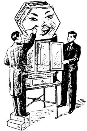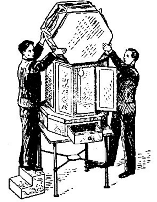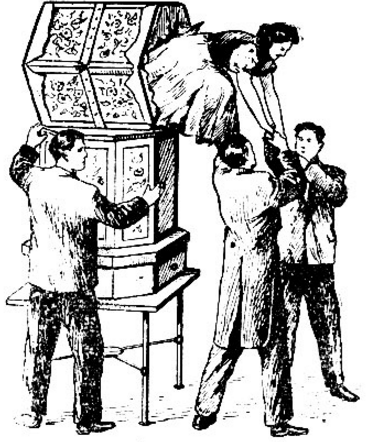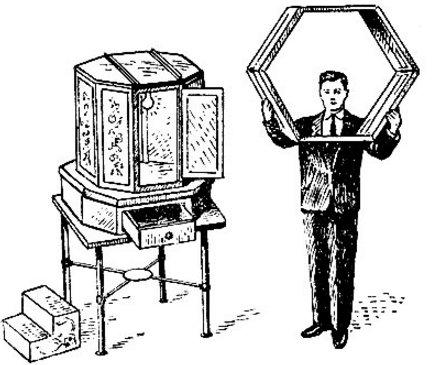 Справочник / Эффектные фокусы и их разгадки Описание фокуса: Помощники выносят один небольшой столик, на котором стоит второй столик, сделанный на шарикоподшипниковых роликах. На втором столике стоит небольшой восьмигранный шкафик. Повернув столик кругом, помощники ставят аппарат на пол и уходят за кулисы, откуда тотчас же возвращаются: один несет небольшую ступеньку-подставку, которую ставит около аппарата, другой - деревянный шестигранник (рис. 184).
