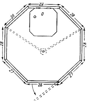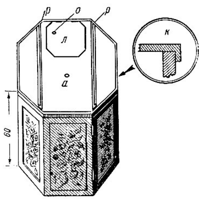 На рис. 193 нанесены остальные размеры шкафика (в сантиметрах). Шкафик состоит из восьми стенок, одна из которых - дверка, открывающаяся наружу. Стенки шкафика сделаны из рам с филенками из трехмиллиметровой фанеры. Сверху на стенки шкафика плотно надевается крышка К, которая крепится к стенкам с помощью разборных петель со стержнями-штифтами. Крышка сделана из 10-миллиметровой фанеры. На ней проложены две рейки Р в виде уголков. Расстояние от рейки до рейки сделано такое, чтобы между ними плотно могла лечь нижняя створка "тамбурина". Кроме того, в крышке есть отверстие, в которое пропускается конец стойки.