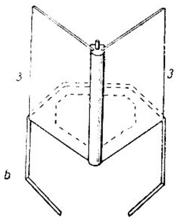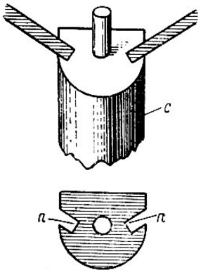 Стойка показана на рис. 194; сделана она из твердого дерева, высота ее равна высоте внутренней части шкафика. Нижний конец стойки приделан к верхней доске стола, а на верхнем конце сделай штифт, который проходит в отверстие в крышке шкафика. Кроме того, в крышке шкафика в люке сделано еще одно отверстие диаметром 10 мм. Сквозь него пропускается палочка ассистентки, отворяющей люк в "тамбурине". В крышке вырезан люк (см. рис. 193.) Люк вырезается наискось, чтобы его можно было открывать кверху и чтобы он не западал вниз. В стойке с обеих сторон сделаны вырезы - пазы n (см. рис. 194). Ширина пазов равна толщине зеркал, из которых состоит оптическое приспособление. В нашем иллюзионе толщина зеркал 8 мм.