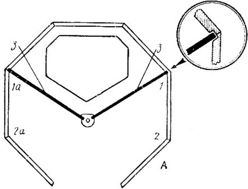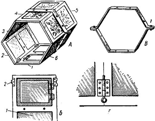 6. "Тамбурин" - это шестиугольный цилиндр, сделанный из шести деревянных рам с вставленными в них фанерными филенками. Рамки "тамбурина" разные по ширине (рис. 197, А). Стенки 1 и 4 по 45 см шириной, стенки 2 и 6 - по 43 см и стенки 3 и 5 - по 40 см. Длина всех стенок 72 см. Филенки из трехмиллиметровой фанеры, за исключением стенки 1, где нужна фанера в 8 или 6 мм. Стенка 1 имеет секретный люк, устроенный так, чтобы его не было заметно сверху. Для этого верхняя сторона крышки шкафика маскируется рисунком. Устройство люка ясно из рисунка 197, Б. С боковой стороны люка ставятся пружинные петли, которые открывают люк внутрь "тамбурина". Люк сохраняется закрытым благодаря защелке 2. Помощник открывает защелку снизу в тот момент, когда "тамбурин" ставят на полозья шкафика. Защелка сделана на пружине, подобно английскому дверному замку, она автоматически захлопывает люк и держит его в закрытом состоянии до тех пор, пока помощник не отведет ее пальцем назад. Посередине "тамбурина" надет металлический никелированный скрепляющий обруч, состоящий из двух половин (рис. 197, В). Ширина обруча равна ширине планок стенок "тамбурина". Обручи прикрепляются к стенкам с помощью болтиков, вделанных в потай. Соединяются между собой обе половины обруча тоже болтиками 1, для чего в каждой стороне обруча и в стенках "тамбурина" сделано по два отверстия, через которые и пропускаются скрепляющие болтики.