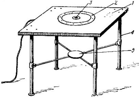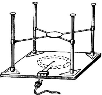 Реквизит: 1. Столик для аппаратуры. 2. Стол иллюзиона с двумя ящиками. 3. Шкафик иллюзиона с зеркалами и люком. 4. "Тамбурин" с люком. 5. Ступеньки-подставка. 6. Два обруча для затягивания бумаги на "тамбурине". 7. Электрошнур для подводки тока к столику. 8. Штук 8-10 больших красивых шелковых шарфов или гирлянд. 9. Два больших листа бумаги для затягивания "тамбурина". 10. Уголек для рисования. Устройство аппарата. 1. Стол для аппаратуры - универсальный, на нем можно показывать различные иллюзионы, он легко разбирается и быстро собирается (рис. 188). Верхняя доска стола сделана следующим образом: из деревянных брусьев толщиной в 30 мм сколачивается рама, которая покрывается 8-10-миллиметровой фанерой. Поверх фанеры шурупами к столу прикрепляется круглый рельс-дорожка 2 для скольжения по нему роликов, вделанных в дно иллюзиона. В центре стола укреплено нижнее кольцо упорного вертикального шарикоподшипника. В центре дна стола иллюзиона (см. ниже) укрепляется штифт-ось, который входит в кольцо 3. На кольцо кладется подшипник с шариками, и благодаря этому вся тяжесть иллюзиона ложится на упорный шарикоподшипник. Иллюзион на роликах, идущих по кругу рельсовой дорожки, очень легко поворачивается вокруг своей оси. К доске стола снизу к углам прикреплены четыре треугольных фланца (рис. 189, А), к которым приварены небольшие отрезки труб с резьбой внутри. В эти трубы ввертываются металлические (из труб) никелированные ножки 4 (см. рис. 188), на нижнем основании которых сделаны для большей устойчивости стола небольшие кружки.