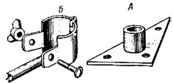 Крестовина 5 сделана из тонких металлических никелированных труб. На середине к ней приварен никелированный круг, дающий прочность всей крестовине. Все это служит большей устойчивости стола. Крестовина крепится к ножкам стола с помощью "хомутиков" (см. рис. 189, Б). Хомутики надеваются на ножки стола, ив них вставляются концы крестовины, после чего хомутики закрепляются с помощью пропускаемых сквозь них болтиков с "барашками". Сборка стола происходит следующим образом: в верхнюю доску ввертываются все четыре ножки и стол ставится на ножки. Затем под стол ставят подставку-лесенку и на нее кладут крестовину. Надев на ножки хомутики, пропускают сквозь них концы крестовины и с помощью "барашков" завинчивают болты. Сборка стола окончена. Размер верхней доски стола 75х75 см, высота 80 см.