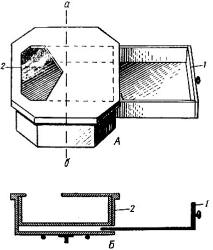 2. Стол иллюзиона. К нему прочно приделывается шкафик с оптическим устройством. (Хранится и транспортируется стол вместе со шкафиком.) Как видно из рис. 190, стол иллюзиона - это только верхняя часть стола без ножек, 1 - выдвигающийся ящик. На рис. 190, Б показан стол в разрезе с выдвинутым ящиком. Он сделан из четырех досок: две боковые, одна передняя и дно (задней стенки нет). Ящик находится между дном другого внутреннего ящика, вделанного в столе из 10-миллиметровой фанеры, и дном стола иллюзиона, сделанным из такой же фанеры. Стол иллюзиона - со срезанными углами, то есть восьмиугольный. Размер верхней доски стола (в зависимости от габарита ассистентки) от 75х75 до 80х80 см. Высота (толщина) 25-28 см. Выдвижной ящик сделан со стопорами (набитыми сбоку планками), чтобы при выдвигании он не мог выпасть. При выдвижении ящика доска, укрепленная в столе (передняя часть внутреннего ящика), не позволяет зрителям видеть внутреннее устройство аппарата. Зрителям кажется, что они видят четвертую заднюю стенку выдвинутого ящика.