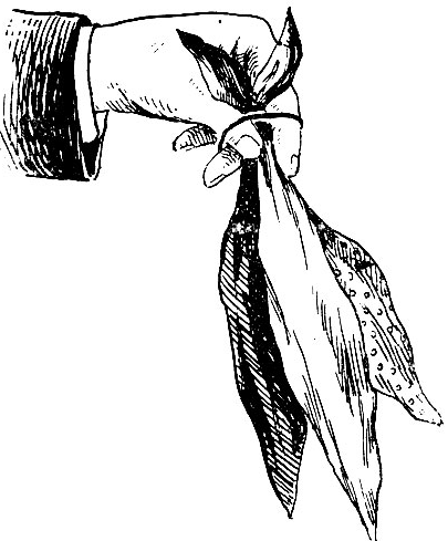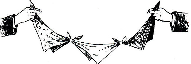 Справочник / Эффектные фокусы и их разгадки Описание фокуса: Артист берет в руки красивый с никелированным ободом сачок из материи на длинной ручке и идет к зрителям. Он опускает руку в сачок и, вывертывая его наизнанку, показывает, что в сачке ничего нет. Так он проделывает раза два. Затем фокусник обращается к зрителям и просит их одолжить ему на несколько минут штук шесть носовых платков. Зрители сами кладут платки в сачок, который им подставляет фокусник. Когда зрители положат шесть платков, артист возвращается с сачком на сцену. Зрители видят, что платки заполнили сачок до краев. Фокусник опускает руку внутрь сачка и вынимает из него шесть шелковых больших носовых платков: два синих, два желтых и два красных. Артист кладет все платки на стол на виду у зрителей, затем тотчас же опять опускает руку в сачок и вывертывает его наизнанку. В сачке ничего нет. Платки зрителей исчезли, а вместо них появились шелковые разноцветные платки, которые лежат на столе. Фокусник кладет сачок на стол, забирает платки и, пересчитав их, кладет на спинки двух стульев, по три на каждую спинку. Показав на платки, фокусник говорит: "Вы видели, что все шесть платков я разделил по три, все они развязаны. Я свяжу эти три платка. - Подходит к левому стулу, связывает платки и показывает. - Вот так (рис. 223).