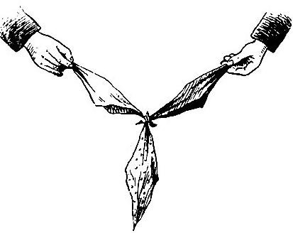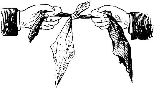 Крепко натяните угол правого платка, чтобы он образовал прямую линию и чтобы левый обвивался вокруг него. Теперь возьмите концы узла и конец правого платка, поместите сзади конца левого и введите его спереди в образовавшуюся петлю и затягивайте второй узел, но следя при этом за тем, чтобы правый платок был все время натянут по прямой линии. Если будет нужно, то при завязывании придерживайте его пальцами. Таким образом, левый платок сделает вокруг правого два узла, и его можно будет легко сдвинуть и снять. Делая вид, что вы затягиваете узлы, старайтесь в это время сделать узлы такими, чтобы они легко скользили по правому платку, но чтобы в то же время были достаточно крепки и преждевременно не могли соскочить с него. Если вглядеться в рис. 231, то можно заметить, что правый платок (он заштрихован) натянут между руками, а левый обвязан двумя узлами вокруг него. Очень трудно дать точное описание завязки таких скользящих узлов; их можно вязать по-разному, необходимо лишь научиться очень быстро завязывать узлы, не глядя на платки.