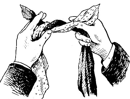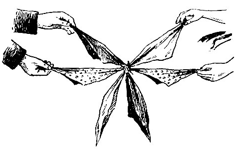 4. Резиновые кольца из очень хорошей эластичной резины надеваются на держатель, откуда их берут по мере надобности. Диаметр колец лучше всего 10 мм. Если не удастся достать кольца такого диаметра, то придется большие кольца сложить в несколько раз. Секрет фокуса. Один из трех секретов этого фокуса - это шанжировочный сачок. В нем платки, взятые у зрителей, обмениваются на заранее положенные туда шелковые платки. Второй секрет - это секрет связывания платков. Для незаметного связывания, как вы, вероятно, уже догадались, применяются резиновые кольца, надетые на держатель. Этот держатель заранее привертывают незаметно за спинкой стула и надевают на него штуки три-четыре резиновых кольца. Чтобы незаметно связать платки, поступают следующим образом: берут три платка в правую руку и держат их за уголки большим, указательным и средним пальцами, незаметно снимают с держателя резиновое кольцо, как показано на рис. 228. Сейчас же передают один платок в левую руку, он замаскирует находящееся там резиновое кольцо. Когда правой рукой подносят второй платок, левой рукой быстро сгибают уголок платка и пропускают его в резиновое кольцо. Кольцо не отпускают и, поднеся второй платок, опять слегка сгибают его верхний уголок и тоже продевают в кольцо. Затем тотчас же отпускают кольцо с пальцев - оно крепко соединит уголки двух платков. Передайте (теперь уже связанные кольцом) два платка в правую руку и непринужденно взмахните ими, в то же время незаметно снимая с держателя второе кольцо. Передайте два (связанных) платка опять в левую руку и взмахните одним платком в правой руке; в этот момент приготовьте кольцо на левой руке для приема платков. Поднесите правой рукой платок к левой и, присоединив его верхний уголок к одному из нижних уголков платка левой руки, немного согните ушки и проденьте их в кольцо. Затем спустите кольцо с пальцев. Получится цепь из трех платков (см. рис. 223). Собирая эту цепь платков вместе, чтобы положить их, фокусник берет платки за несвязанные концы, следя за тем, чтобы связанные резинками концы были в середине свертка платков; это замаскирует резинки от взоров зрителей. На рис. 229 показан момент связывания резиновым кольцом трех платков "звездой". При связывании платков "звездой", как трехконечной, так и шестиконечной, поступают так: левой рукой незаметно снимают с держателя резиновое кольцо (рис. 228). Затем, передавая из правой руки по одному платку в левую, пропускают их концы в резиновое кольцо.