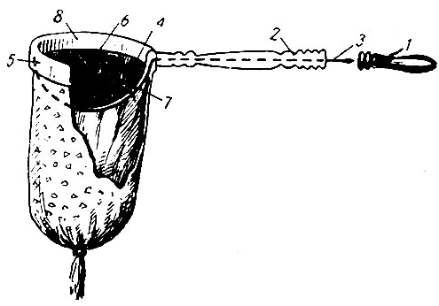 Если посмотреть на рис. 227, то можно заметить, что ручка 1 сделана отдельно от рукоятки 2. Ручка плотно насаживается на металлический стержень 5, который проходит сквозь отверстие в рукоятке 2 и выходит внутрь обода. Там стержень выгибается по профилю обода в полукольцо 4 и, согнутый под прямым углом, входит в наружный край обода, где служит осью 5 для повертывания полукольца внутри обода и сачка. Стержень 3 показан в момент опускания внутрь сачка. Как ясно из рисунка, стержень поворачивается посредством ручки 1.