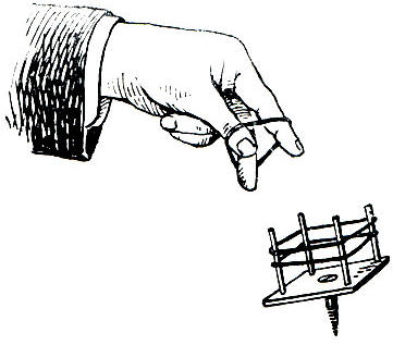 Внутренний мешочек сачка состоит из двух частей: первая - мешочек такой же, как и наружный, а вторая - это полоса материи, вшитая в середину мешочка; она делит мешочек на две равные части. Будучи пришитой к полукольцу, эта полоса материи при повороте стержня то открывает, то закрывает половину мешочка, деля его на отделения 6 и 7. Незаметным поворотом ручки 1 повертывают внутри сачка полукольцо 4, переводя его из одной стороны сачка в другую. Если теперь положить платок внутрь сачка и незаметно перевести полукольцо на другую сторону, то платок в сачке "пропадет", на самом же деле он будет находиться внутри за полосой материи, пришитой верхним краем к полукольцу. Теперь можно вывернуть сачок наизнанку, и зрители, кроме подкладки сачка, ничего не увидят. Мы подробно описали конструкцию сачка, чтобы любители поняли принцип его изготовления. Добавим лишь, что и наружный мешочек и его подкладка пришиваются к узкому тонкому металлическому обручу диаметром, равным внутреннему краю обода. Через пробитые отверстия обруч привертывается мелкими винтиками к большему краю обода внутри него так, чтобы не мешать движения полукольца. Ширина обода делается с расчетом свободного вращению полукольца с пришитой полосой материи и помещения в нем обруча с пришитым к нему мешочком сачка. Шанжировочный сачок будет очень полезен для многих фокусов в дальнейшем, и поэтому не стоит жалеть ни средств, ни труда на его изготовление. 2. Шелковые платки размером 40?40 см по два платка трех разных цветов. 3. Держатель для резиновых колец изображен на рис. 228. Он сделан из металлической пластинки, в центре которой приварен шуруп, позволяющий легко ввертывать держатель в дерево. Кроме того, к пластинке приварены четыре стойки высотой 40 и толщиной 4 мм. На стойки надеваются резиновые кольца.