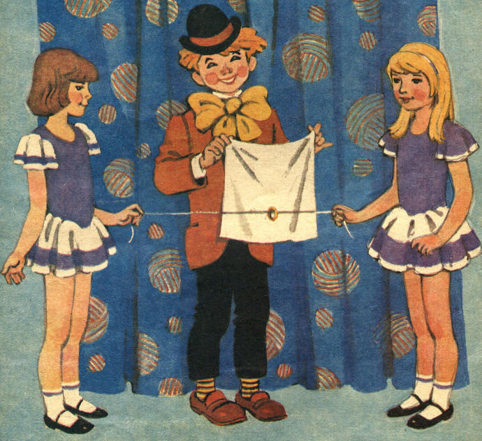 Èñïîëíèòåëü ïðèãëàøàåò ê ñåáå íà ñöåíó äâóõ ïîìîùíèêîâ èç çðèòåëüíîãî çàëà. Çàòåì áåðåò íåáîëüøóþ ïî ðàçìåðó âåðåâêó, íàäåâàåò íà íåå ìåòàëëè÷åñêîå êîëå÷êî è îòäàåò âåðåâêó äâóì ïîìîùíèêàì. Ïîìîùíèêè ñòîÿò äðóã ïðîòèâ äðóãà è äåðæàò íàòÿíóòóþ âåðåâêó çà êîíöû. Èñïîëíèòåëü áåðåò ïëàòîê, íàêðûâàåò èì êîëå÷êî íà âåðåâêå è, ñîñ÷èòàâ äî òðåõ, ñíèìàåò ïëàòîê - êîëüöî îêàçûâàåòñÿ íå íà âåðåâêå, à â ðóêå âîëøåáíèêà!