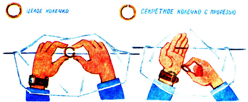 Âûçâàâ íà ñöåíó äâóõ ïîìîùíèêîâ, èñïîëíèòåëü ó âñåõ íà âèäó íàäåâàåò íà âåðåâêó ñåêðåòíîå êîëå÷êî ñ ïðîðåçüþ è äàåò êîíöû ýòîé âåðåâêè èì â ðóêè. Çàòåì, íàêðûâ òó ÷àñòü âåðåâêè, ãäå íàõîäèòñÿ ñåêðåòíîå êîëüöî, îí áûñòðî ïîä ïëàòêîì ñíèìàåò ýòî êîëüöî ñ âåðåâêè, ïðÿ÷åò ïîä ðåìåøîê ÷àñîâ, à öåëîå êîëüöî, êîòîðîå áûëî ïîä ðåìåøêîì, áåðåò â ðóêó. Òåïåðü îñòàåòñÿ òîëüêî ñíÿòü ïëàòîê è ïîêàçàòü çðèòåëÿì è ïîìîùíèêàì êîëüöî, êîòîðîå íåïîíÿòíî êàê îêàçàëîñü ó èñïîëíèòåëÿ â ðóêå.