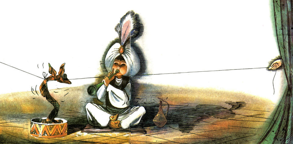 Íà ñöåíå ñòîèò êðóãëàÿ êîðîáêà, íàêðûòàÿ êðûøêîé. Èç-çà êóëèñ âûõîäèò ôîêóñíèê. Íà íåì øèðîêèå øàðîâàðû, íà ãîëîâå - ÷àëìà. È ìû ñðàçó æå óçíàåì â íåì ôàêèðà - óêðîòèòåëÿ çìåé! Îí ñíèìàåò êðûøêó ñ êîðîáêè, áåðåò â ðóêè äóäî÷êó è íà÷èíàåò íàèãðûâàòü íåçàòåéëèâóþ ìåëîäèþ. À ïîä åå çâóêè èç êîðîáêè ìåäëåííî ïîäíèìàåòñÿ çìåÿ. Âñå âûøå, âûøå... Íî íèêòî íå ïóãàåòñÿ, ïîòîìó ÷òî çìåÿ íå íàñòîÿùàÿ: ýòî âñåãî ëèøü ÿðêèé ïëàòîê, çàâÿçàííûé íà êîíöå óçëîì, ïîõîæèì íà çìåèíóþ ãîëîâó. Çðèòåëè, êîíå÷íî æå, óäèâëåíû. Èíòåðåñíî âñå-òàêè - æèâîé ïëàòîê! Ôàêèð ïåðåñòàåò èãðàòü, è "çìåÿ" îïóñêàåòñÿ â êîðîáêó.